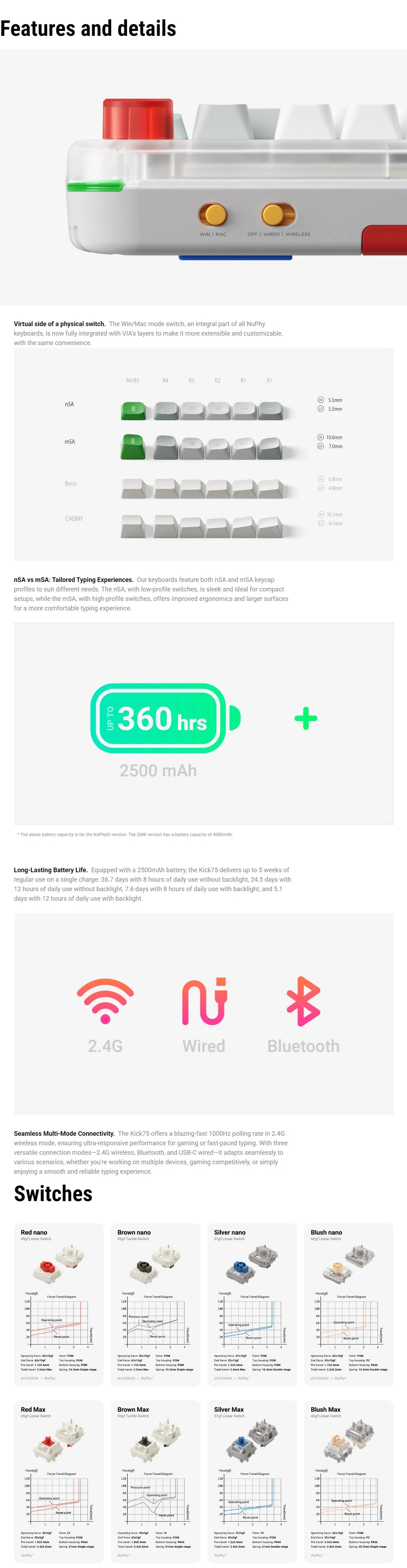 This is a whole new species that sails through your work and play. As the world’s first keyboard with a high-low compatible design, it delivers a seamless switch experience between high-low profile switches. The Nano and Max switches provide an exceptional typing feel with smoothness and satisfying sound. With Bluetooth and 2.4G connectivity, it maximizes work efficiency while being fully capable for gaming. You can express yourself and get things done effortlessly with Kick75.
